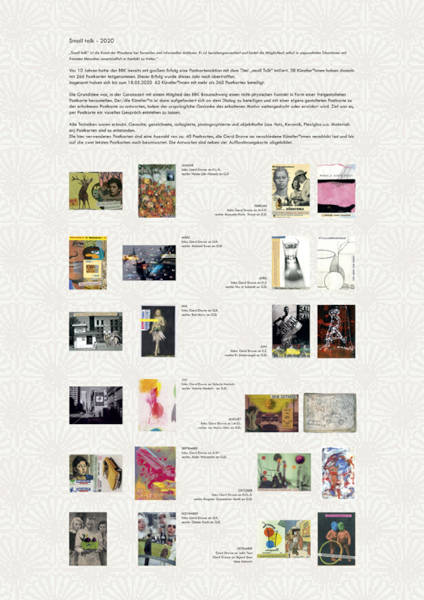 Vor 10 Jahren hatte der BBK bereits mit großem Erfolg eine Postkartenaktion mit dem Titel „small Talk“ durch mich initiiert. 38 Künstler*innen haben damals mit 266 Postkarten teilgenommen. Dieser Erfolg wurde dieses Jahr noch übertroffen.